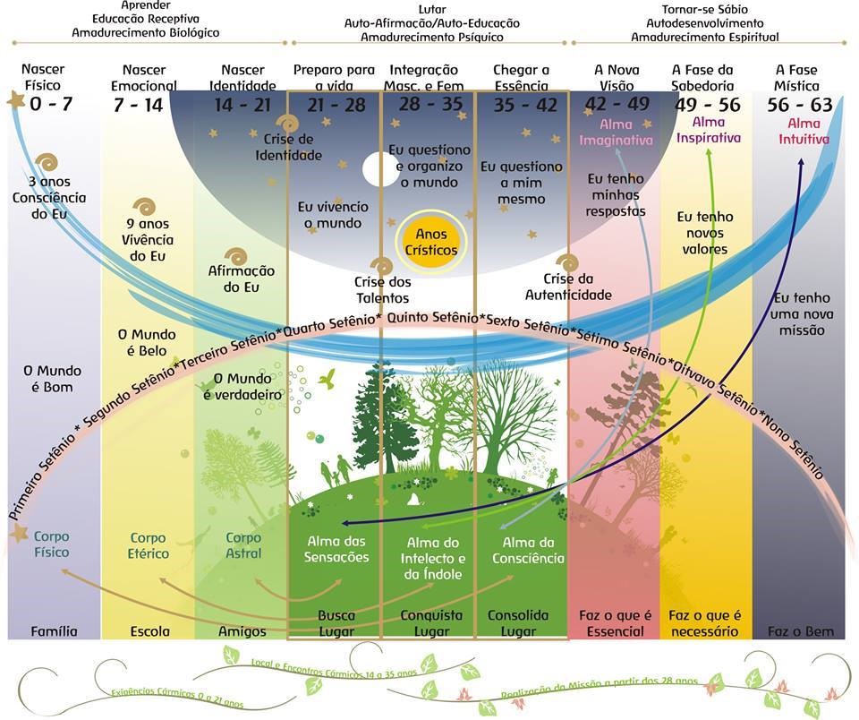 O curso da vida humana enquanto fenômeno vivo é constituído de fases. Segundo a sabedoria oriental, o homem leva 20 anos para crescer, 20 anos para lutar e 20 anos para se tornar sábio. No Trabalho Biográfico, consideramos que a vida humana se divide em períodos de sete anos, ou setênios, que se organizam em três grandes grupos de três setênios cada um. A seguinte imagem é bastante elucidativa das forças e dos processos atuantes em cada fase da nossa biografia.